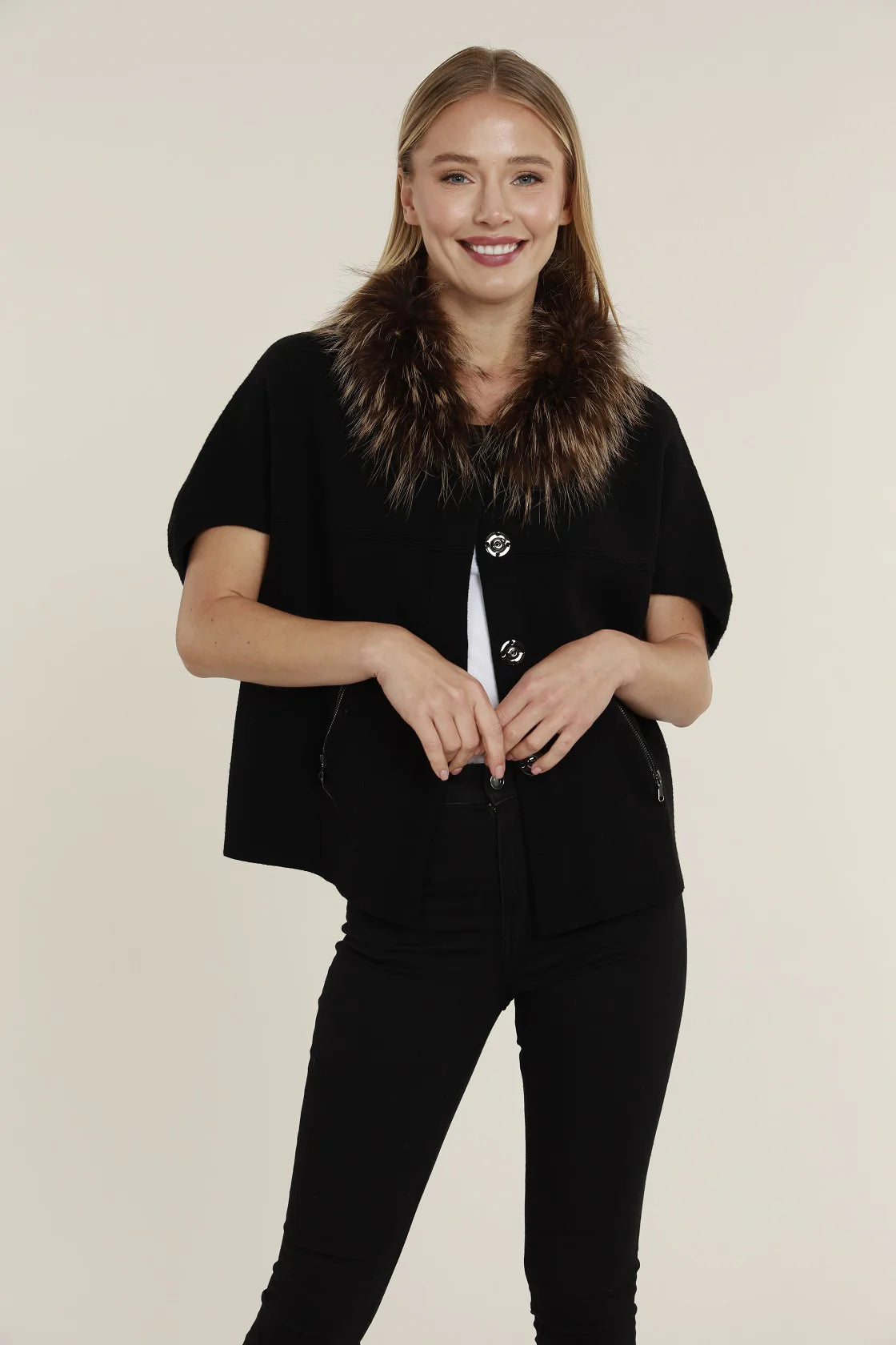 Fur Trimmed Bat Wing Cardi in Black/Chestnut