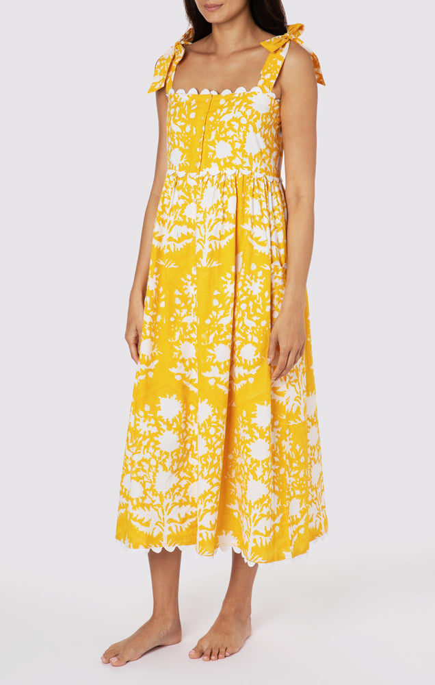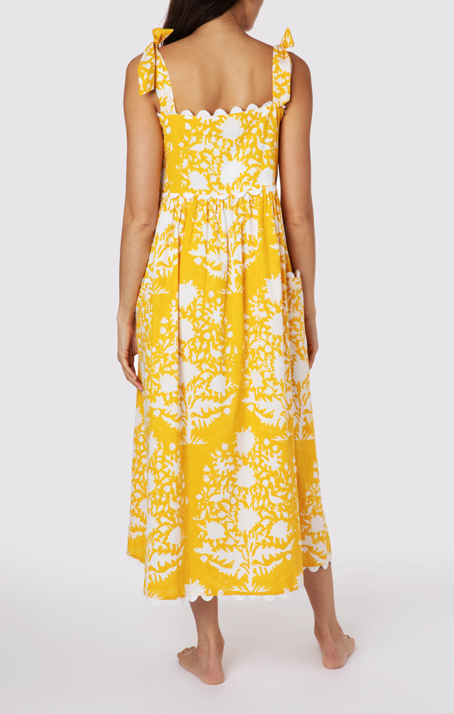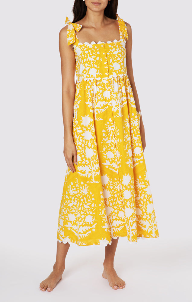 A bestselling shape in a vibrant new colour. Pretty tie shoulder straps allow for easy adjustment and the button through opening means you can wear how you want. This vivid yellow tone is overlaid onto white cotton, creating a stunning contrast. A giant ric rac edging adds a scalloped effect to the neck and hem. The longer length makes this dress ideal for staying cool on days in warm climates.
